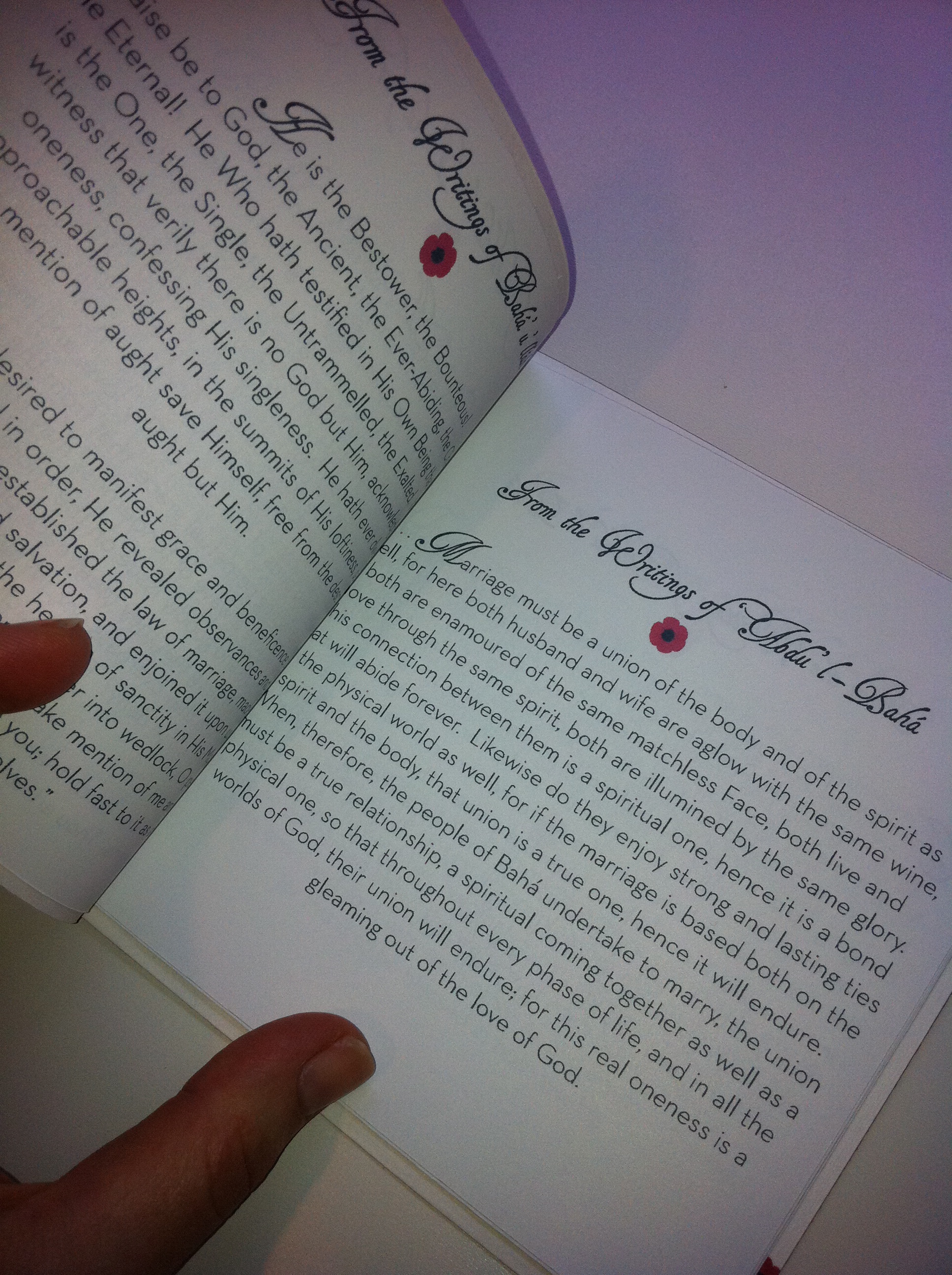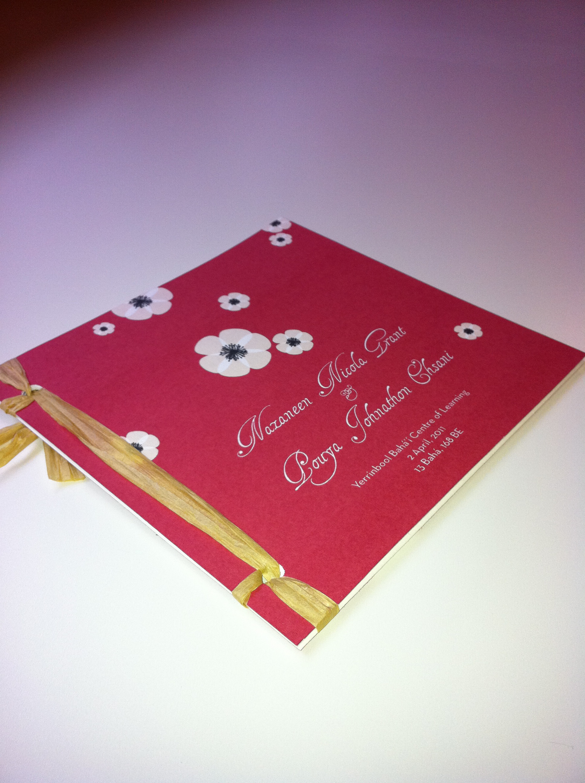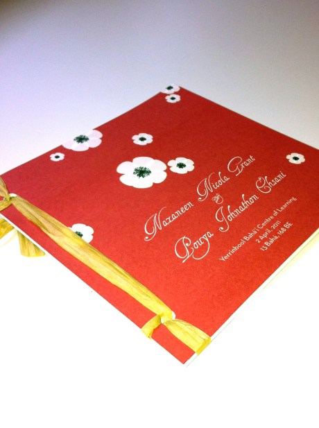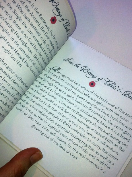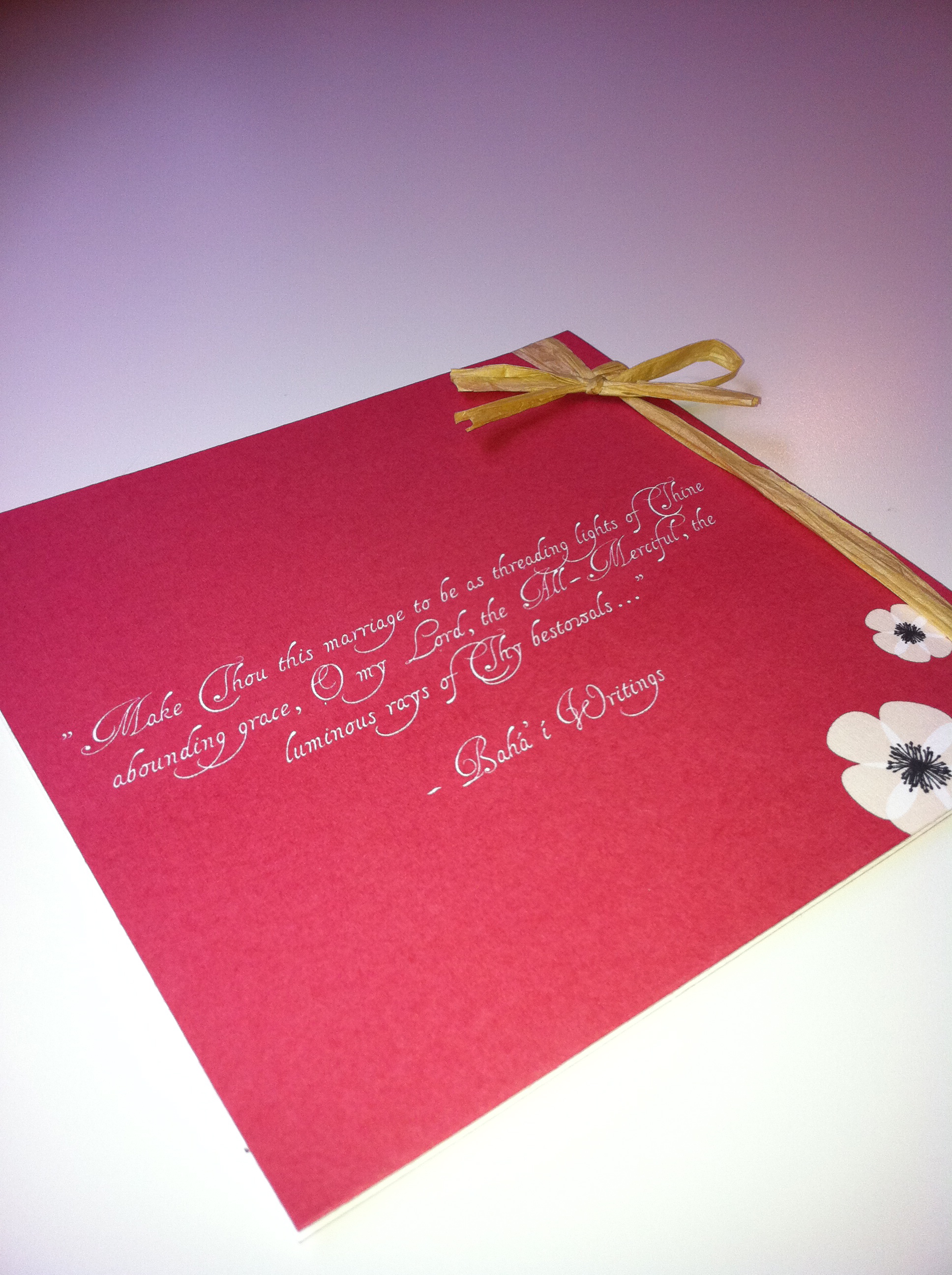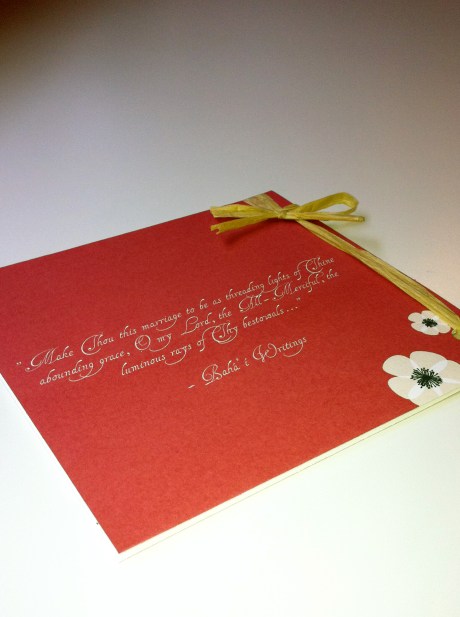 I always love when couples decide to make their programs more than just a program. And every free moment of these last few weeks have been filled with a project for N. and J.P. that did just that. They wanted the programs to be books of the beautiful Bahá’í quotes they filled their ceremony with. They also wanted a pocket in the back to hold a CD of their favorite songs that they put together as a wedding favor for their guests. And not only did they want to give this beautiful gift to their wedding guests, but they wanted to have enough of them to send to their friends and family who weren’t able to attend the wedding. The result: 250 personalized 18-page little books, bound with raffia, and with a CD pocket in the back.