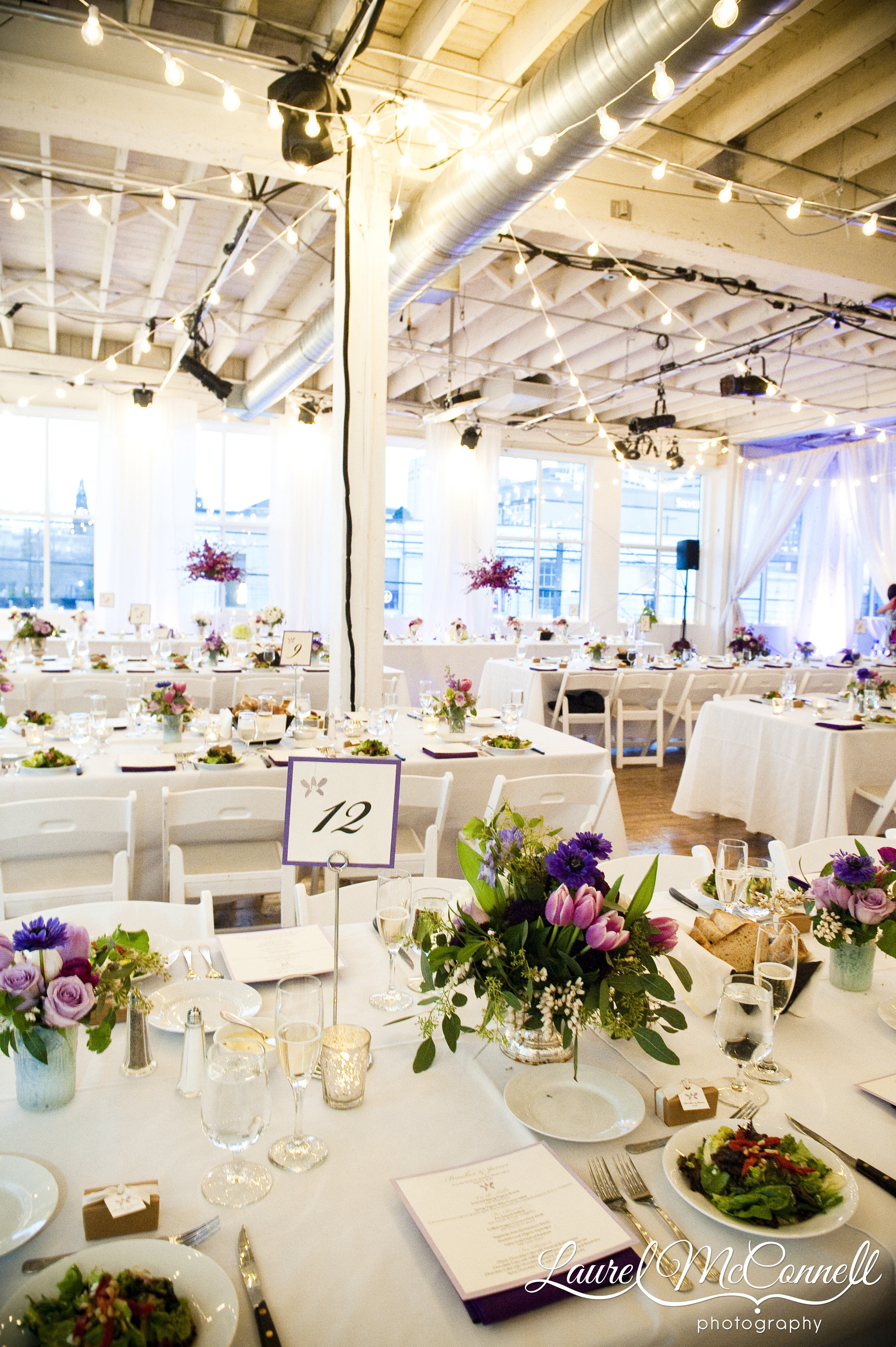 For me, the Escort Cards were the most exciting element I got to work on. Conquering my fear of heights, I hung 10 foot strings of fishing line, with purple orchids and name cards strung all along them. They looked stunning against the soaring Pravda windows!