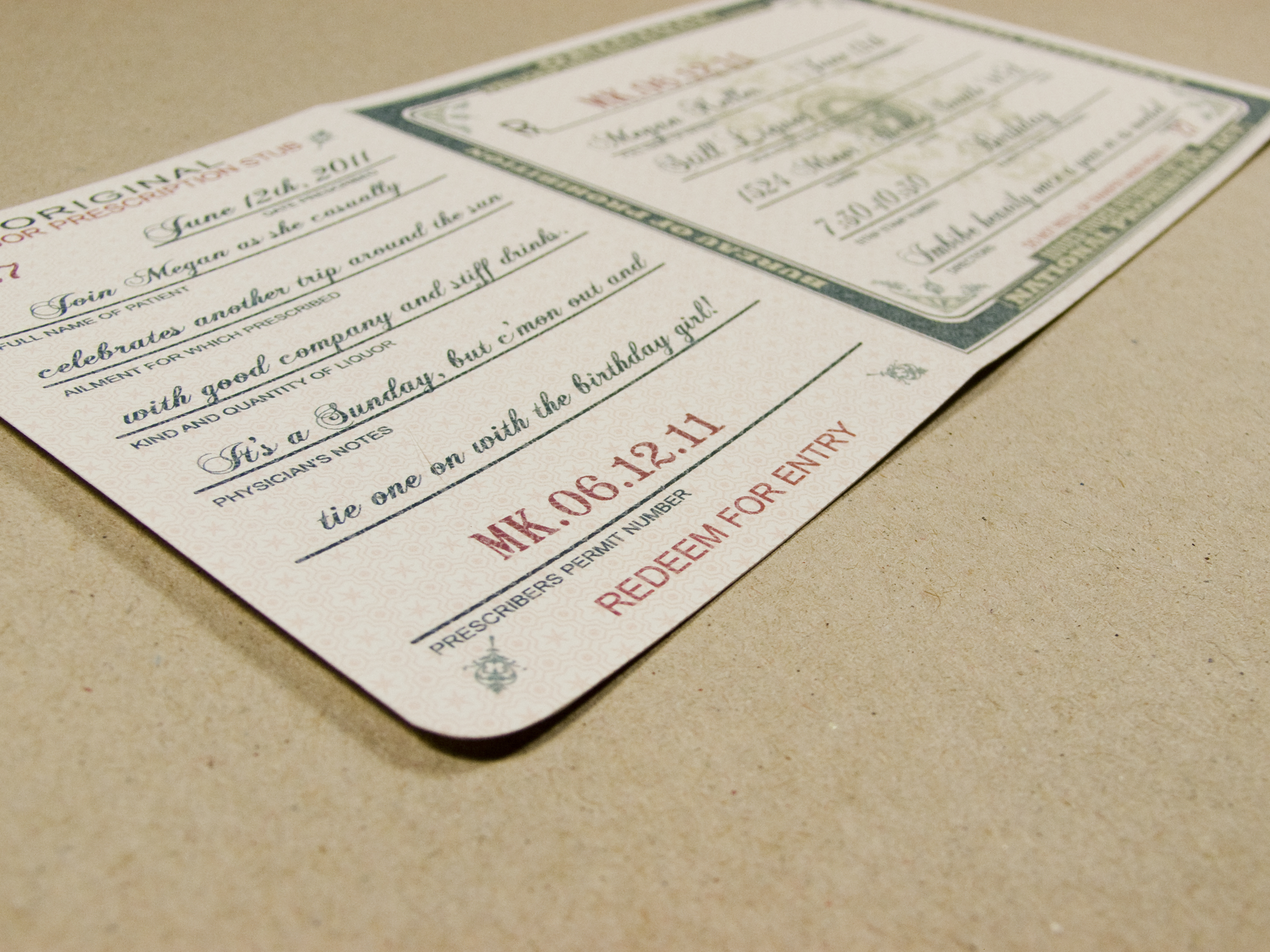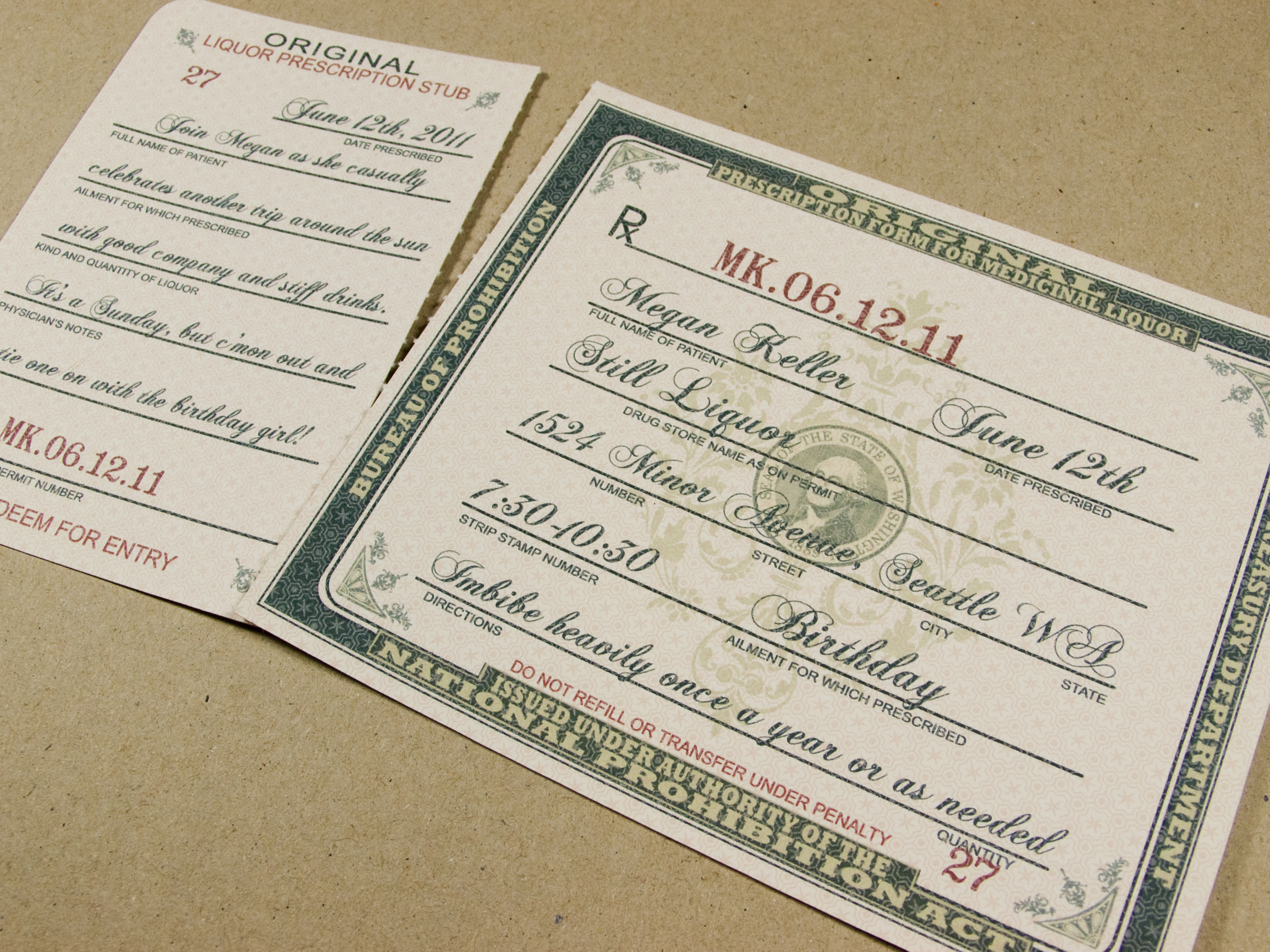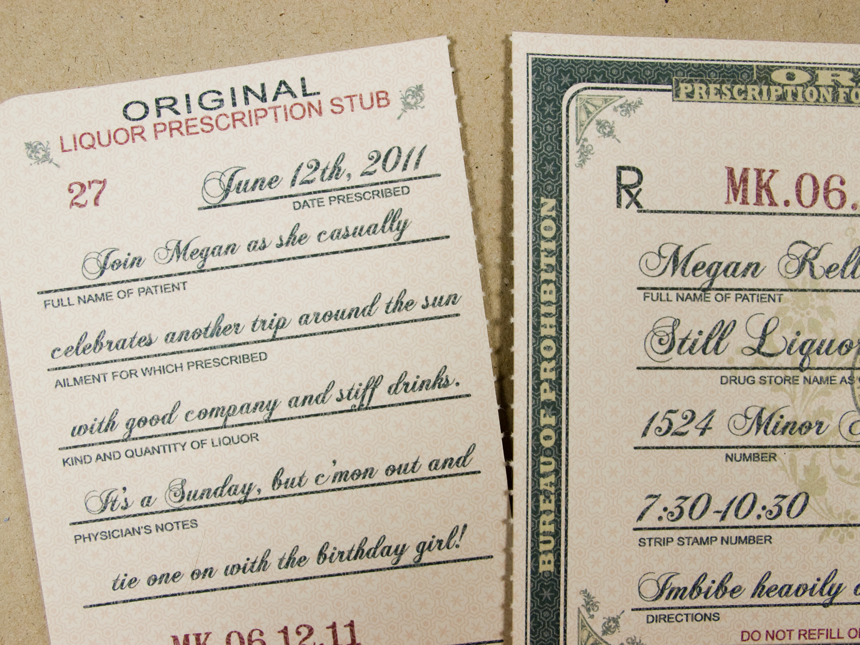 Megan, my dear friend and owner of a Kurant Event, had a fabulous birthday party recently. And what’s more appropriate for a prohibition-style party at a bar than your very own prescription for liquor? It was so much fun to make invitations for her, and I wanted to share a few of those photos!